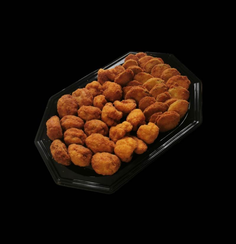 Klasszikus feltéteink: Cordon Bleu, Rántott Csirkemell, Rántott Gomba, Rántott Sajt, Párizsi Karaj, Cigánypecsenye, Mustáros Csirkemell. Leggyakoribb, hogy cserélgetjük az összetételt, például a Párizsi Karaj helyett szeretnének Rántott Karfiolt, Rántott Cukkinit, vagy még Csirkemellet. Gyakori, hogy csak rántott, vagy gluténprobléma esetén csak rostonsültet sütünk a tálra. Tapasztalataink szerint kiadós szokott lenni, gyakoribb, hogy vacsorára is marad. Számos lehetőség van még a feltétek között, variáció sokszáz.